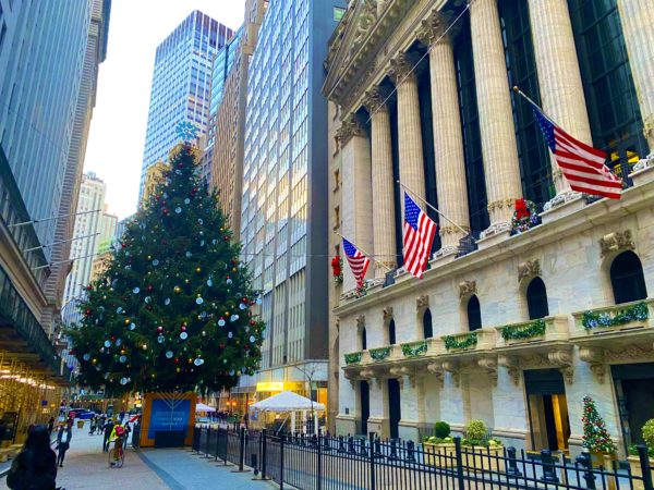 ↑New York Stock Exchange(ニューヨーク証券取引所)前には、毎年恒例の大きなクリスマスツリーが飾られたよ!