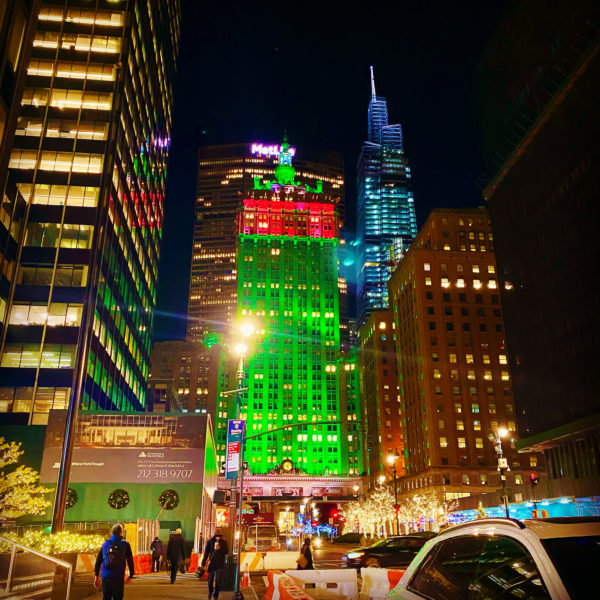 建物は赤と緑のクリスマスカラーで2020年のニューヨークの街を盛り上げた。