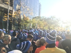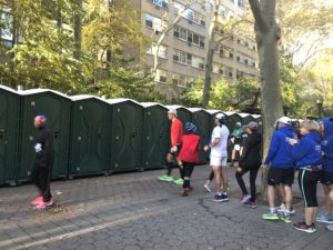 スタート前のトイレは混むので早めに並んでおこう。ニューヨークのどのマラソン大会もトイレはギリギリまで我慢してる人が多いのか結構大変。トイレットペーパーとハンドサ二タイザーはトイレの中にあるので安心。
