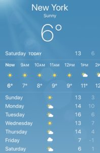朝8am時点の気温は6℃。もうダウンジャケットを着てもいいぐらい寒いニューヨーク。